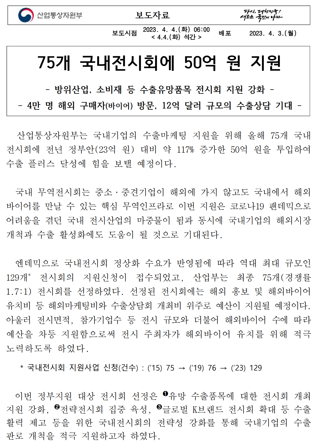 0403(4석간)무역진흥과,75개국내전시회에50억원지원.hwpx